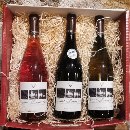 Coffret de 3 bouteilles de Saint Pourçain A.O.P. Issus du Domaine de Bellevue, propriétaire récoltant à Saint Pourçain sur Sioule (03). Ce coffret se compose de trois bouteilles "Grande réserve", rouge, blanc, rosé, de 75 CL